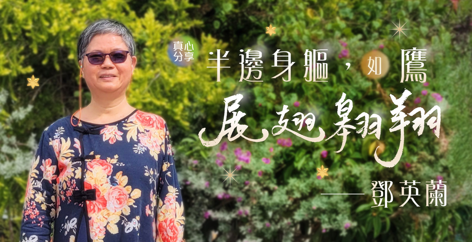 壓傷的蘆葦,祂不折斷。將殘的燈光,祂不吹滅。人生雖苦,但靠著超過所想所求的主恩,帶領我跨越高山低谷。祂的施恩憐憫和安慰,讓我重新經驗人存在的價值。但願主繼續賜下力量,讓我在未來的日子,以生命影響生命,活出更豐盛的人生,為更多人做義務工作。